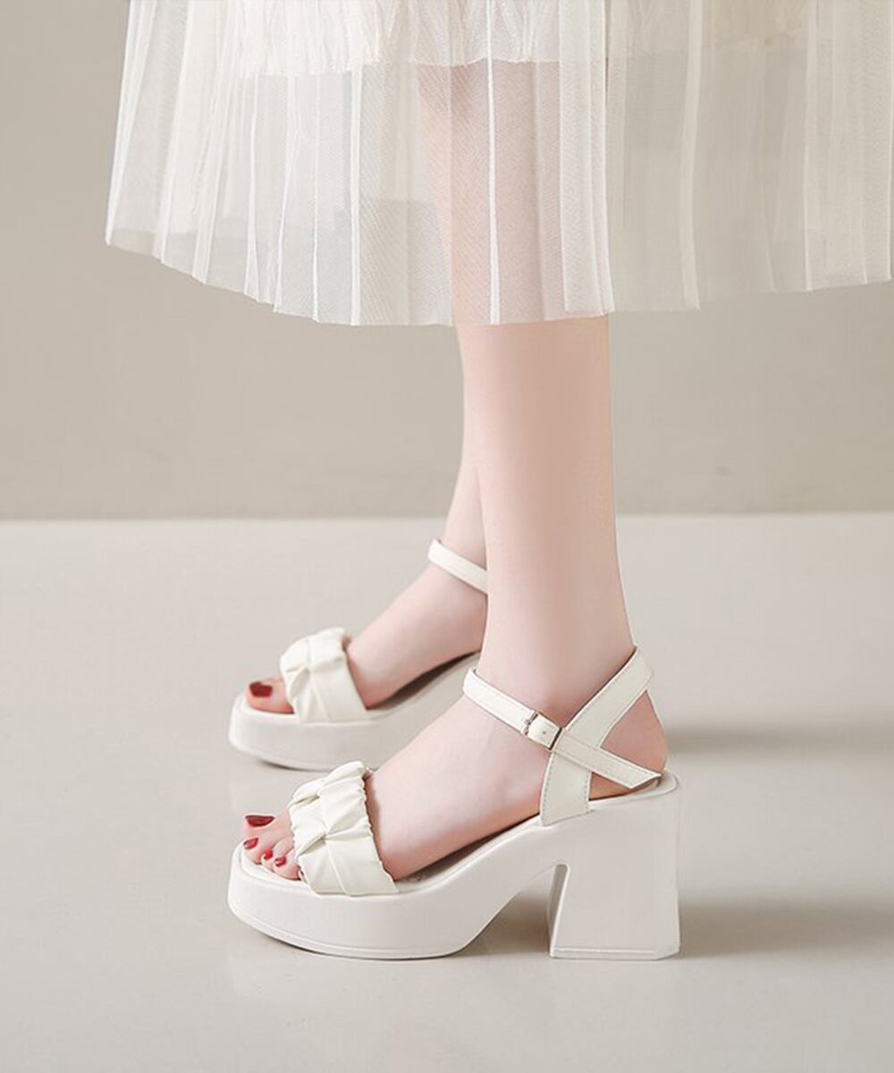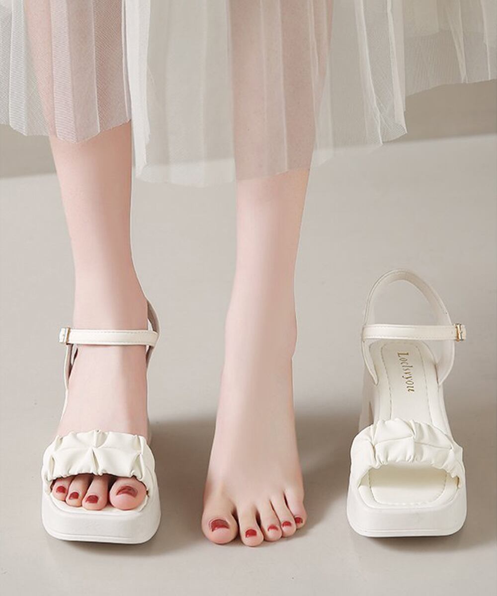 アッパーにはPUレザー素材を使用しており、ギャザーデザインがポイントのチャンキーヒールサンダル