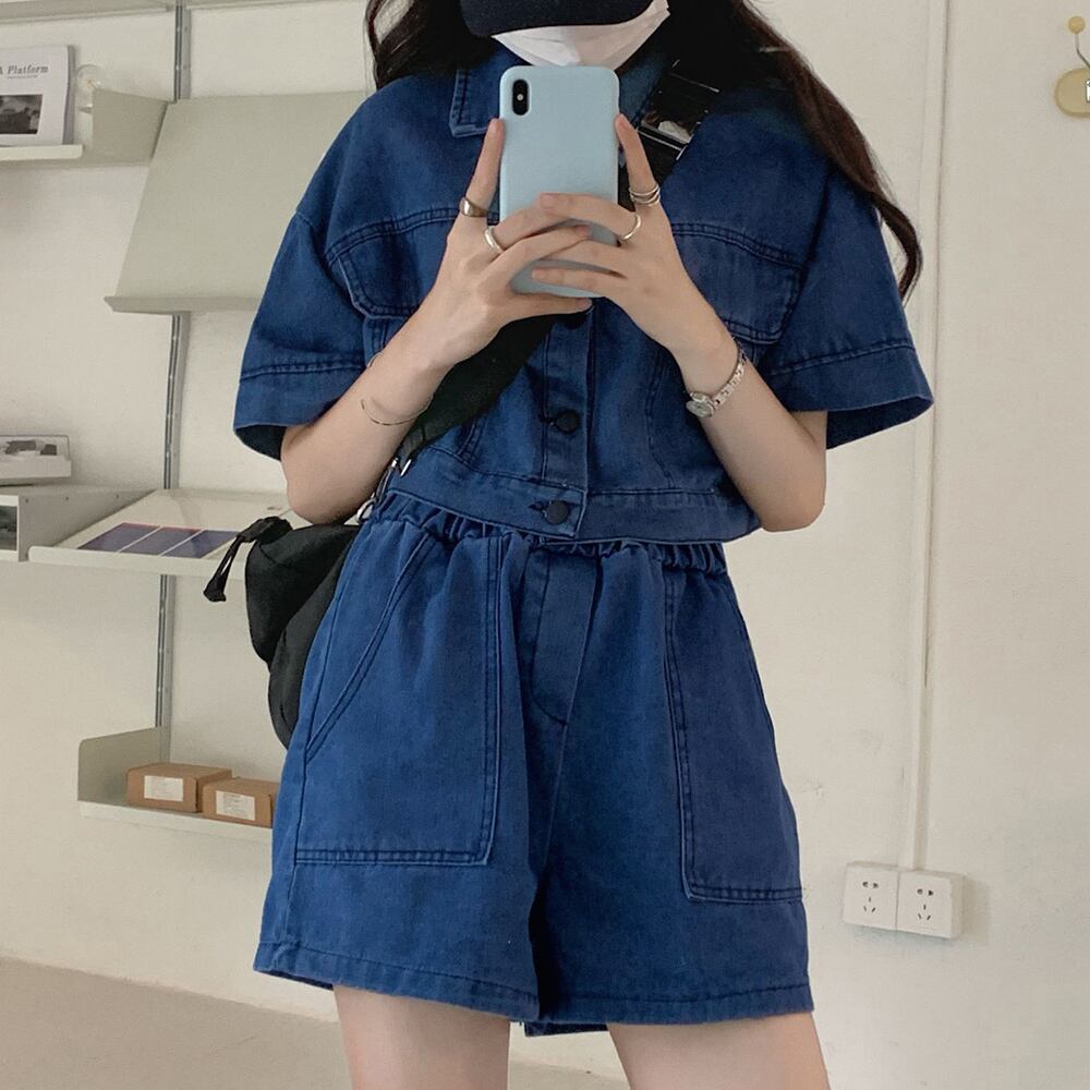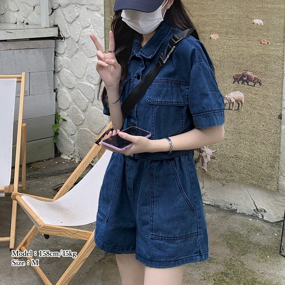 レディース 半袖 デニムジャケット デニムワイドショートパンツ 2点セット おしゃれ アンサンブル レトロジーパンセット